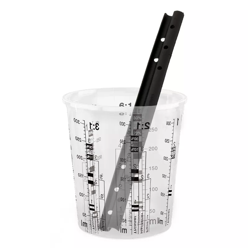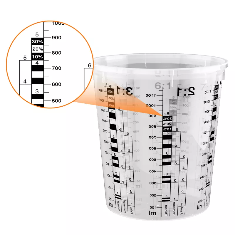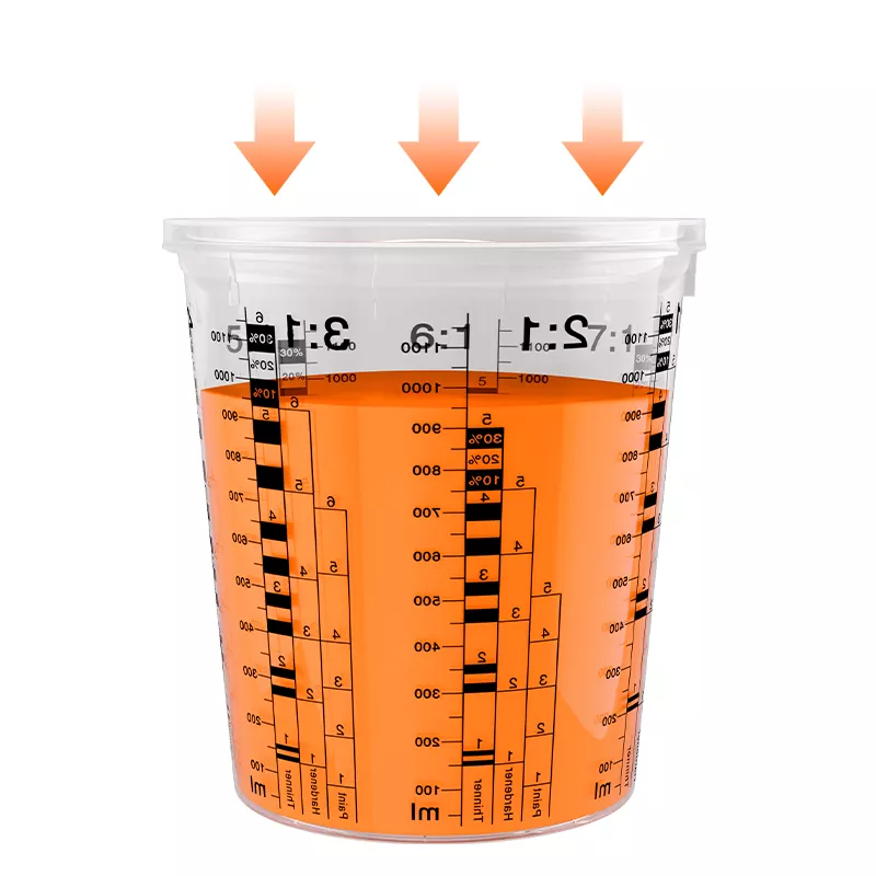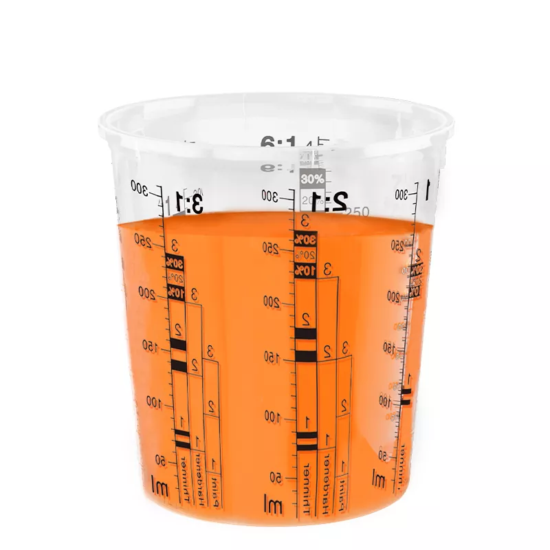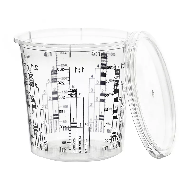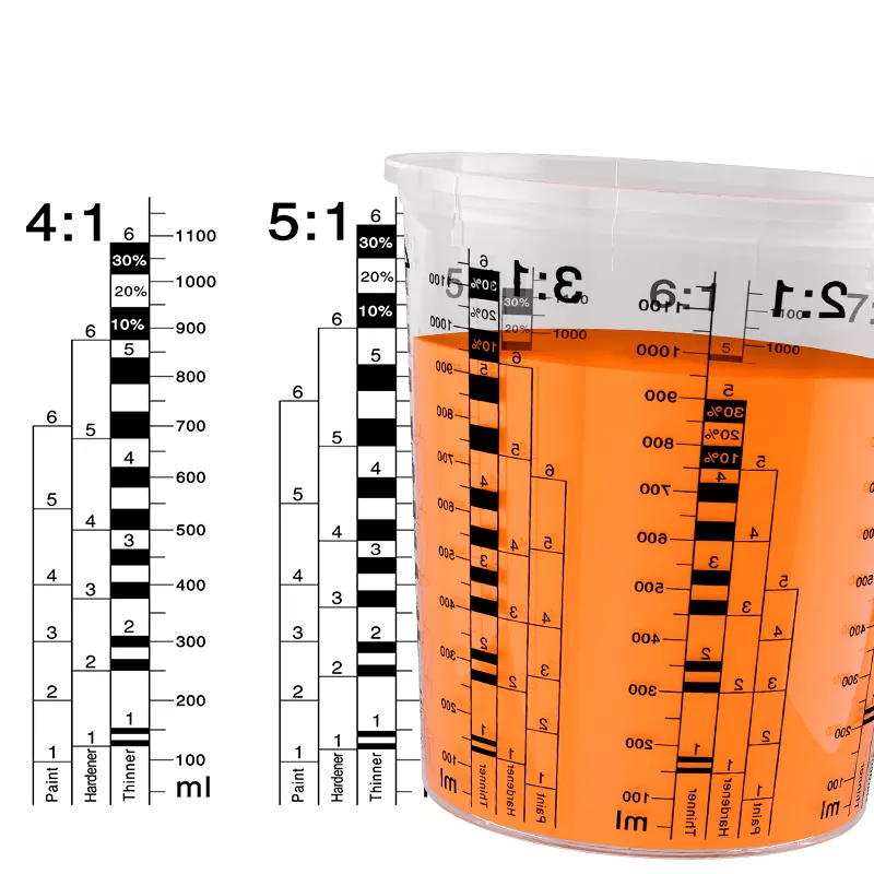 385 ml PP Automotive Paint Mengbeker met deksel voor verfmenging en tijdelijke opslag van gemengde verf. 7 verschillende mengverhoudingen, duidelijk gedrukt en leesbaar van binnenuit. Hoge kwaliteit verfmengbeker met deksel, deksel kan afzonderlijk worden gekocht. We bieden vijf capaciteiten - 385cc, 680cc, 1370cc, 2250cc en 5000cc - om aan elke behoefte te voldoen.