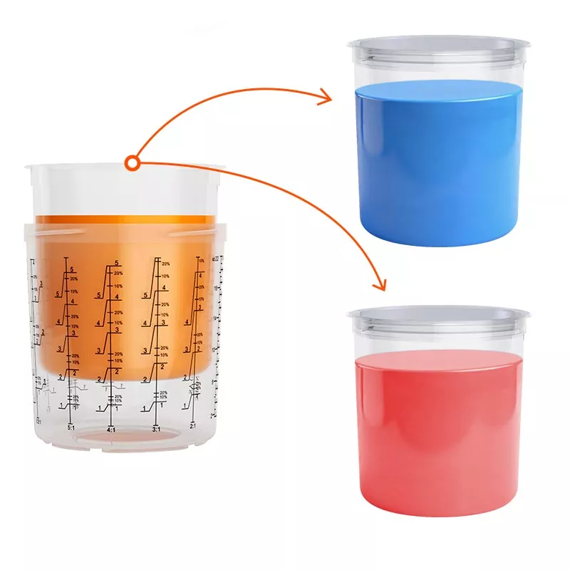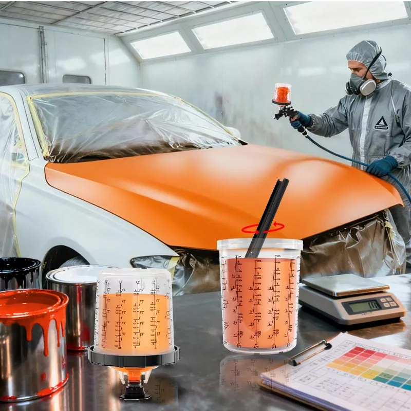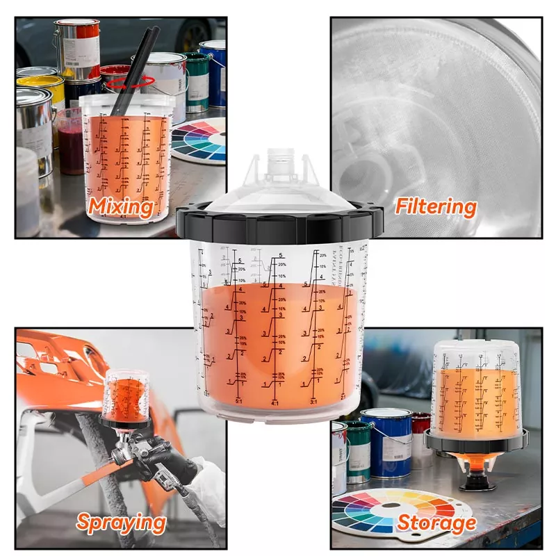 Wegwerpverfbekersysteem combineert meng-, filter-, spuit- en opslagfuncties in één eenheid. Dit vereenvoudigt niet alleen de voorbereiding van het verven, maar bespaart ook de kosten van mengbekers en papiertrechters, waardoor ze de perfecte keuze zijn om voorbereidingstijd te besparen en de spuitefficiëntie te verbeteren.