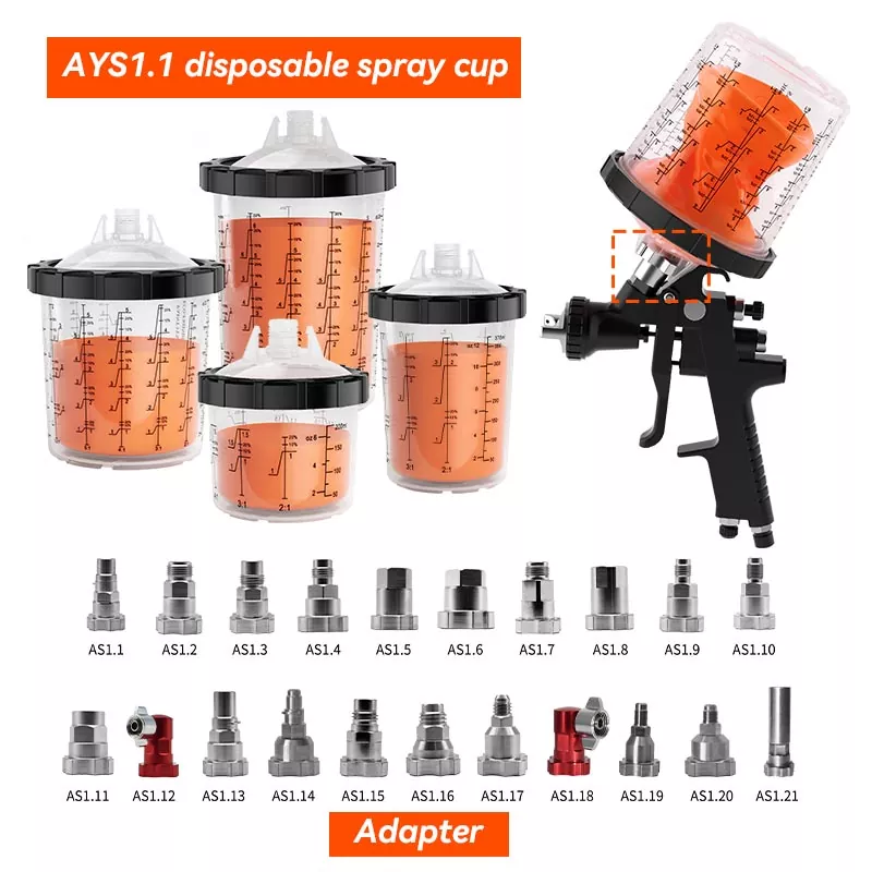 De AYS1.1 wegwerpspuitbeker is compatibel met de PPS1.0-serie adapter. Met de adapter kan hij perfect worden aangepast aan elk merk spuitpistool en kan hij in elke positie worden gebruikt zonder risico op verfdruppels.