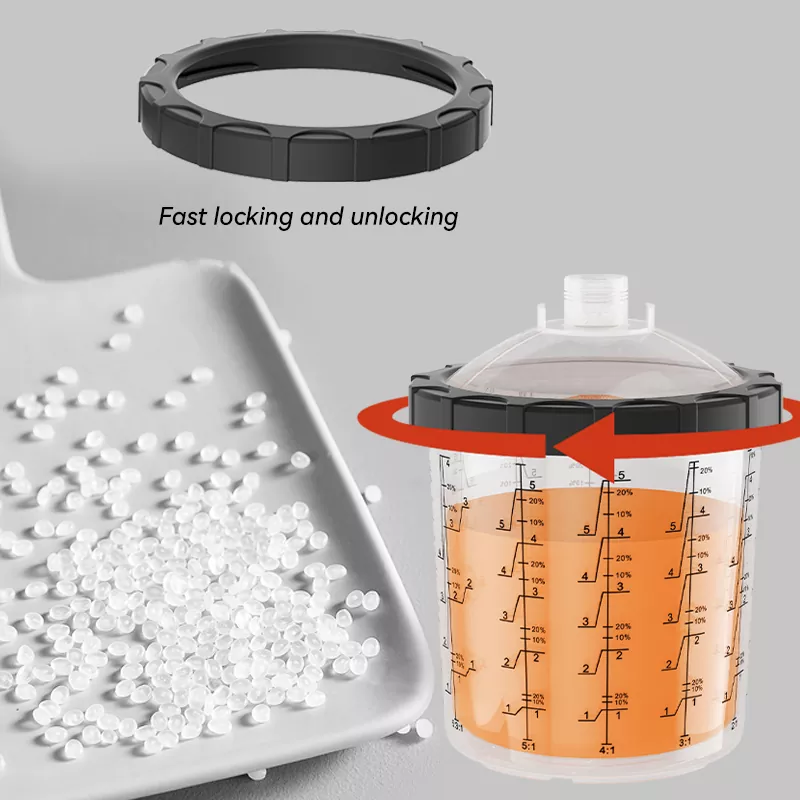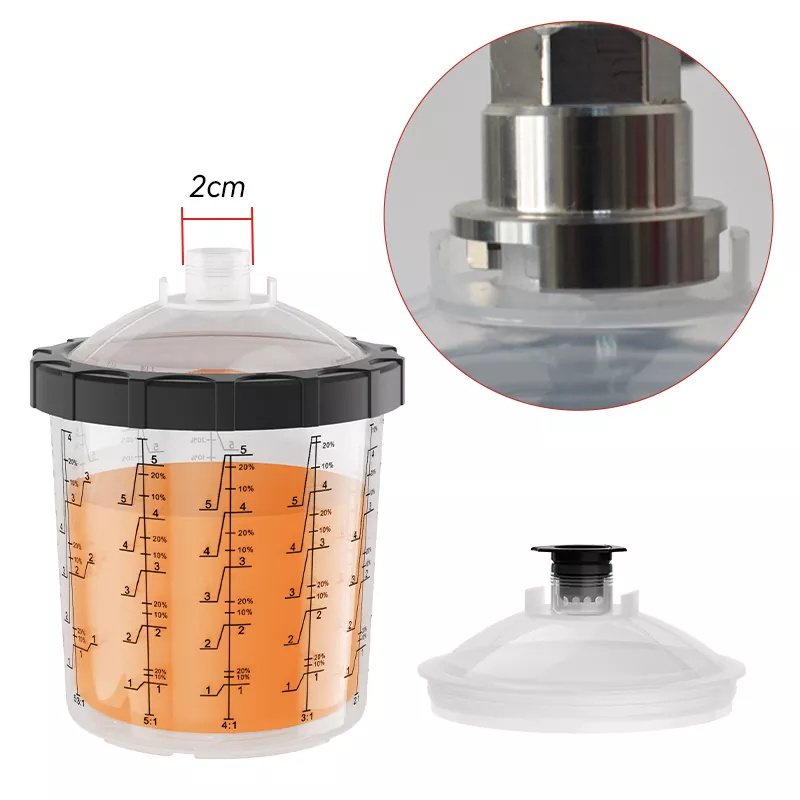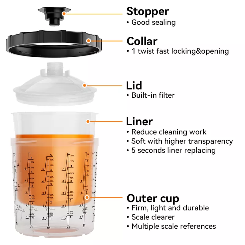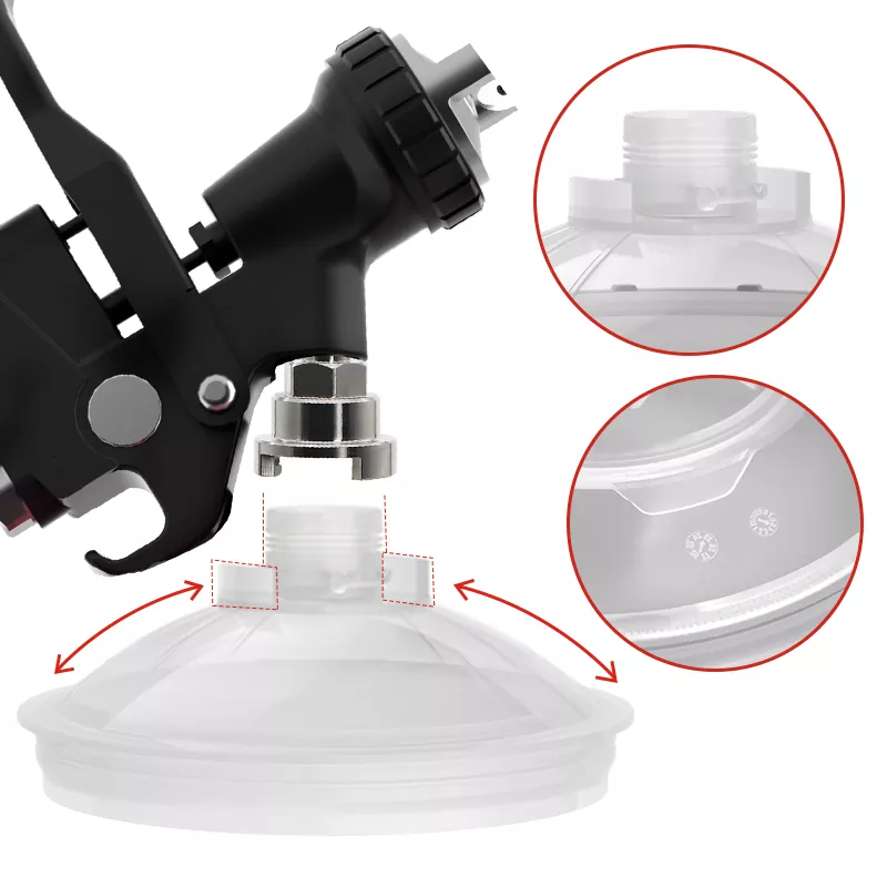 850ML Speedy Paint System 2.0 wordt voornamelijk gebruikt en uitgerust op professionele autospuit- en industriële spuitpistolen. We kunnen meer dan 20 soorten adapters leveren, zodat we aan vrijwel alle merken spuitpistolen op de markt kunnen voldoen. Wat het product zelf betreft, kunnen we filters van 80, 125 en 190 mic leveren, en de voering en het deksel kunnen ook een anti-UV-behandeling ondergaan om te voldoen aan het spuiten en conserveren van een aantal zeer speciale verf. Nadat het schilderen is voltooid, kan de ongebruikte verf in het verfbekersysteem worden bewaard voor het volgende gebruik. Om te voorkomen dat de verf uitdroogt en het filter verstopt, raden wij aan om deze af te sluiten met een plug voordat u het bekersysteem ondersteboven opbergt. Ten slotte zijn liefhebbers van spuitlakken welkom om te komen informeren naar onze producten!