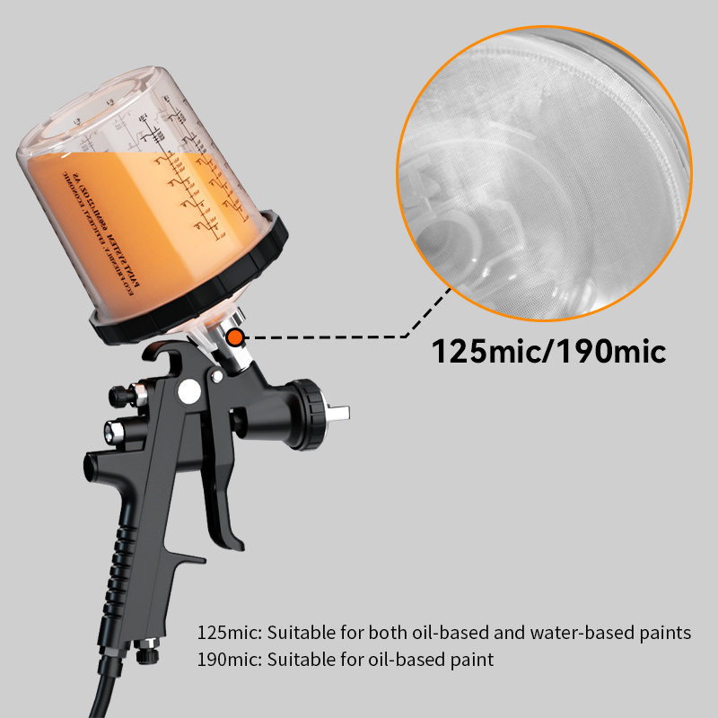 • Ingebouwde geïntegreerde filters voor superieure lakafwerking: De wegwerpbare spuitdop is voorzien van ingebouwde 190μ (verf op oliebasis) en 125μ (verf op waterbasis) filters, die onzuiverheden tijdens het spuiten effectief filteren en de lakglans met 20% verhogen.