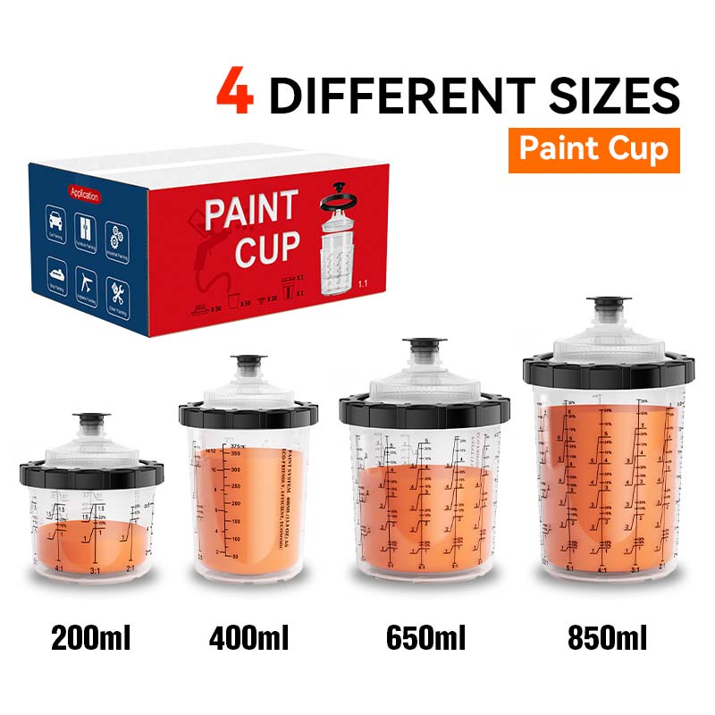 Op basis van marktonderzoek is de Paint Cup beschikbaar in vier capaciteitsspecificaties: 200 ml, 400 ml, 650 ml en 850 ml, catering voor verschillende gebruiksscenario's, hetzij voor sproeien van groot gebied of gedetailleerde aanraking. Bovendien is de binnenbekerstructuur geoptimaliseerd om een gladde verfstroom te garanderen, het verminderen van verstopping en afval.